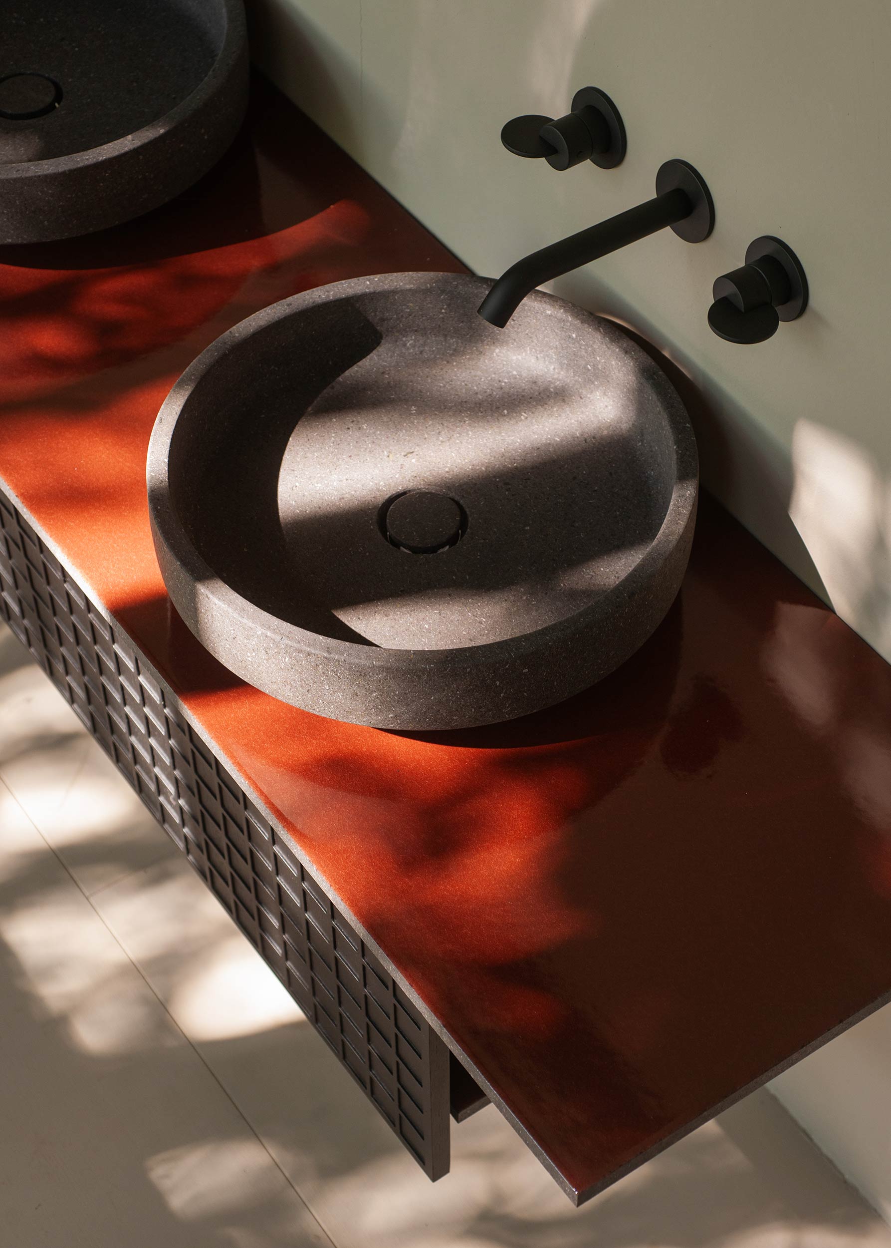 design flexibility. Available in a wide variety of configurations, the new system meets every design need, from residential bathrooms to hospitality spaces, from living areas to wellness contexts. Each configuration is customizable down to the centimeter. Each component of the system can be specified in terms of materials, dimensions, and finishes. Designed to accommodate the entire range of Agape countertop basins, Bloque adapts seamlessly to different architectural contexts while maintaining formal coherence and compositional flexibility.