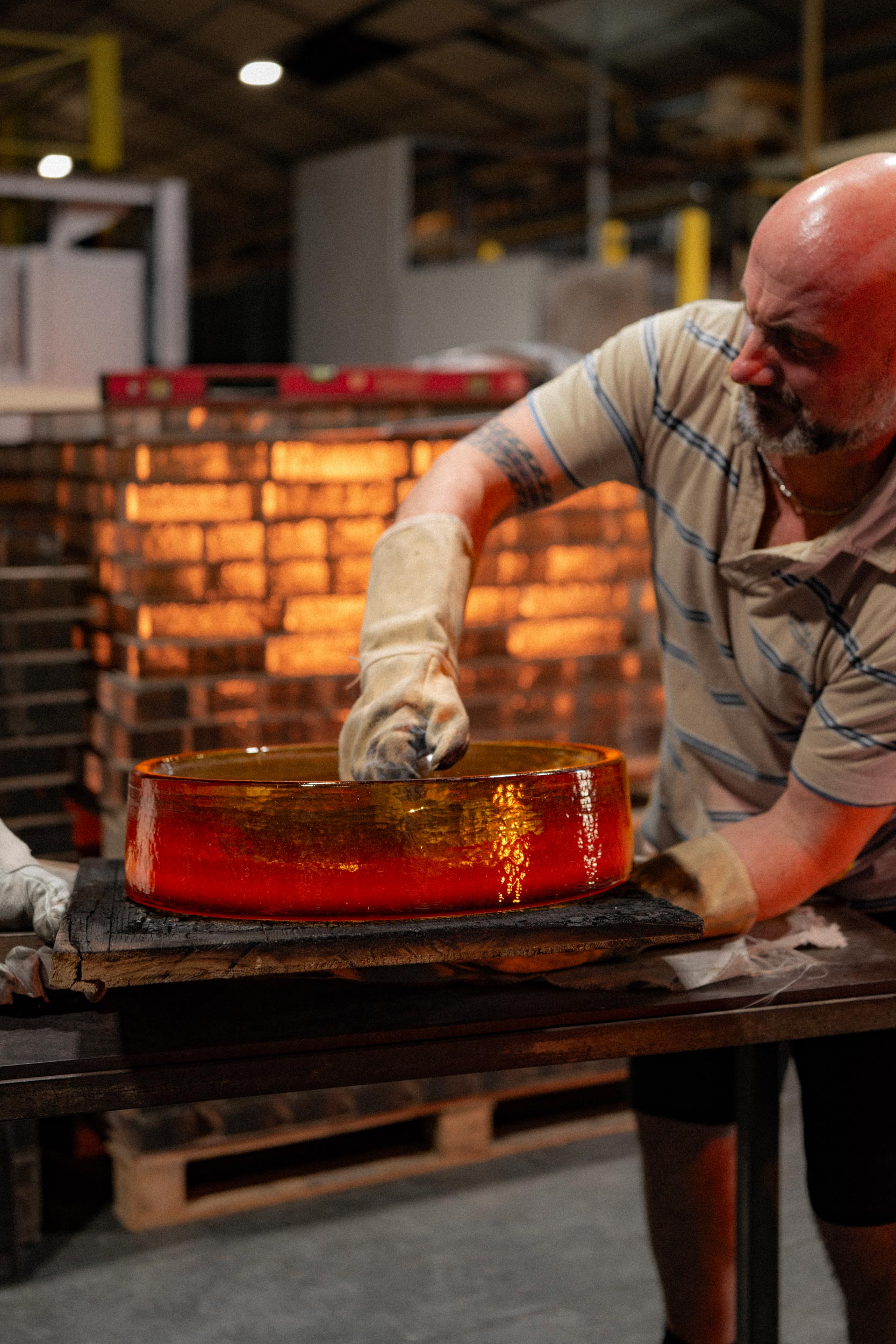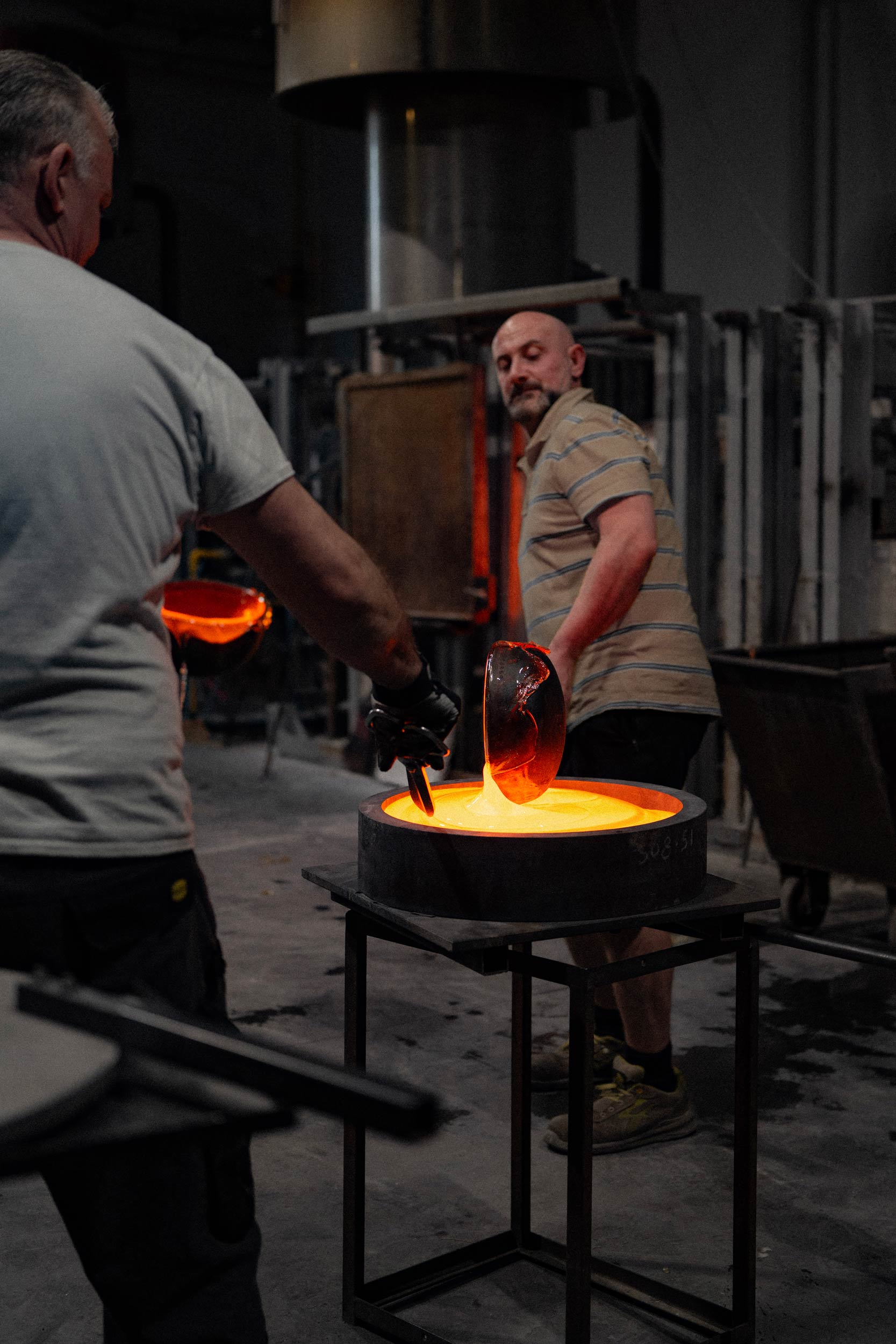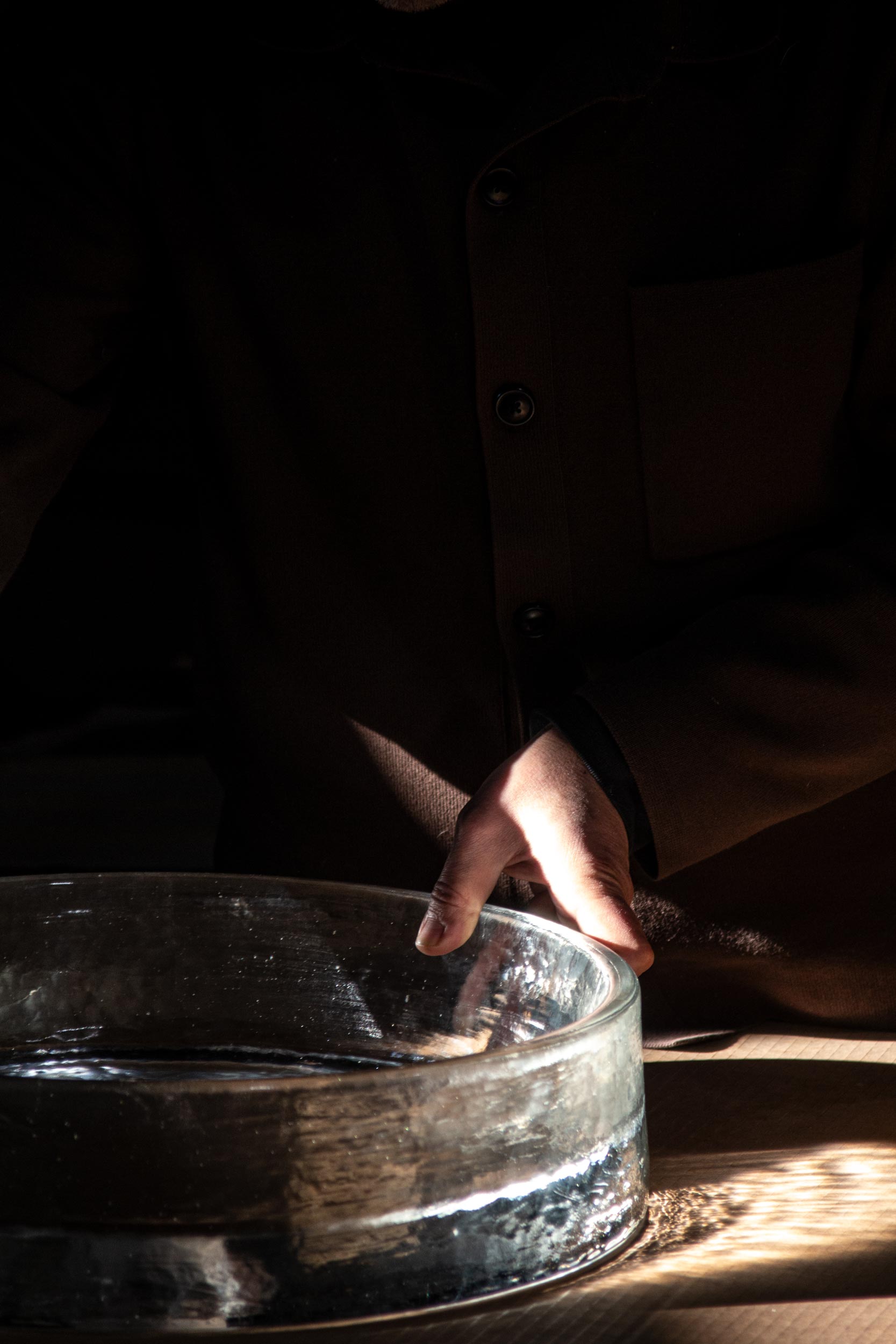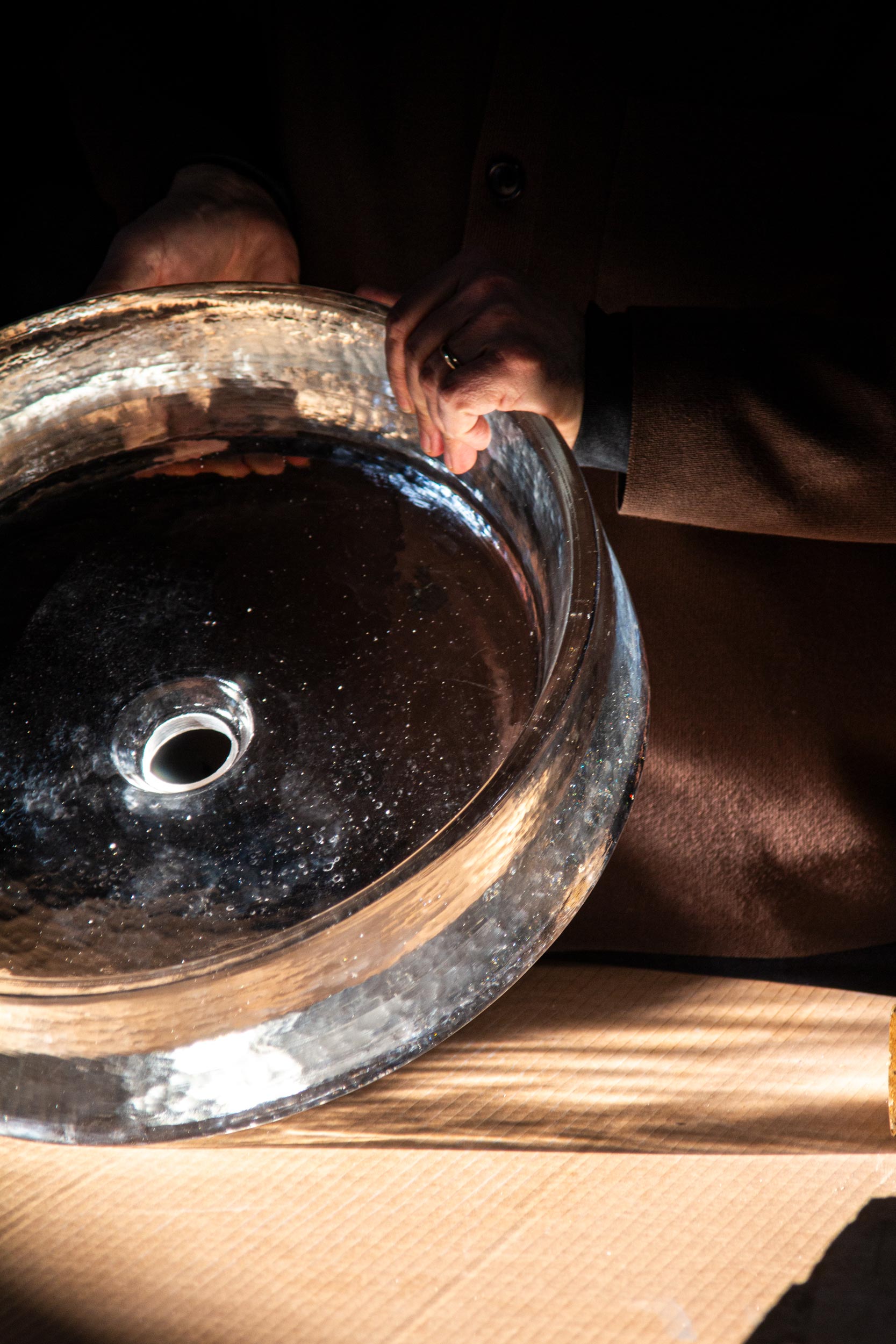 Each basin begins as a mass of eighteen kilograms of glass, fused at over 1200 degrees and poured into a mould. The cooling is slow and precisely controlled: the glass contracts where it meets the mould, creating subtle irregularities that are left untouched. The resulting surface is alive, almost hammered in texture, never identical. An object that does not lie: every detail reveals its origin.