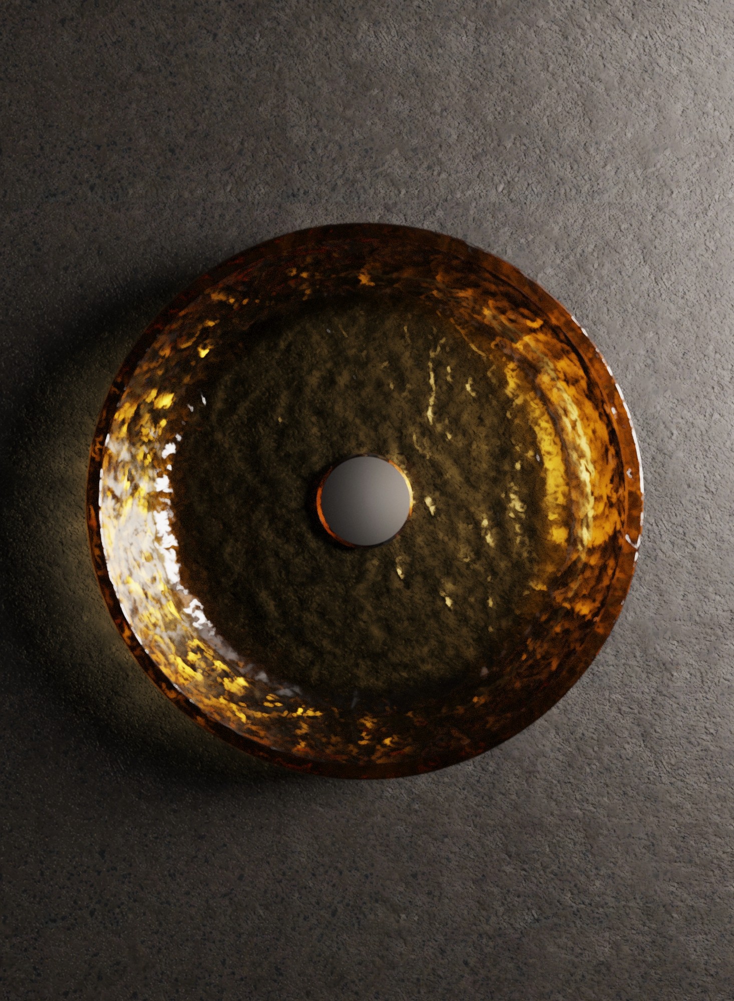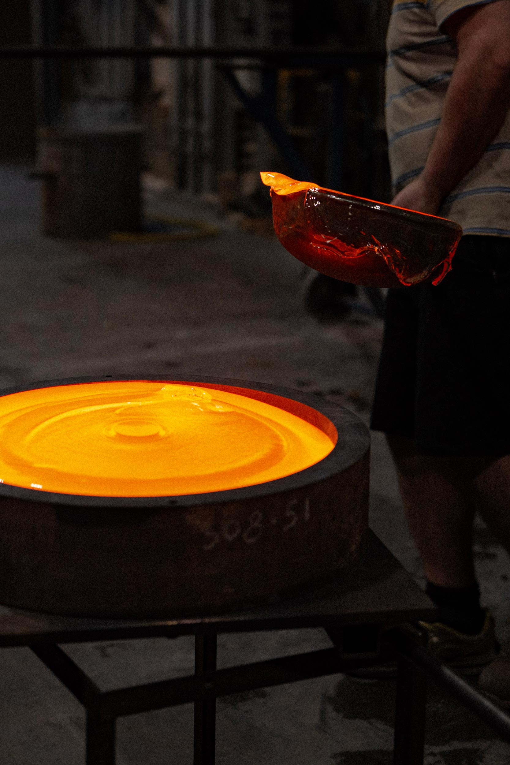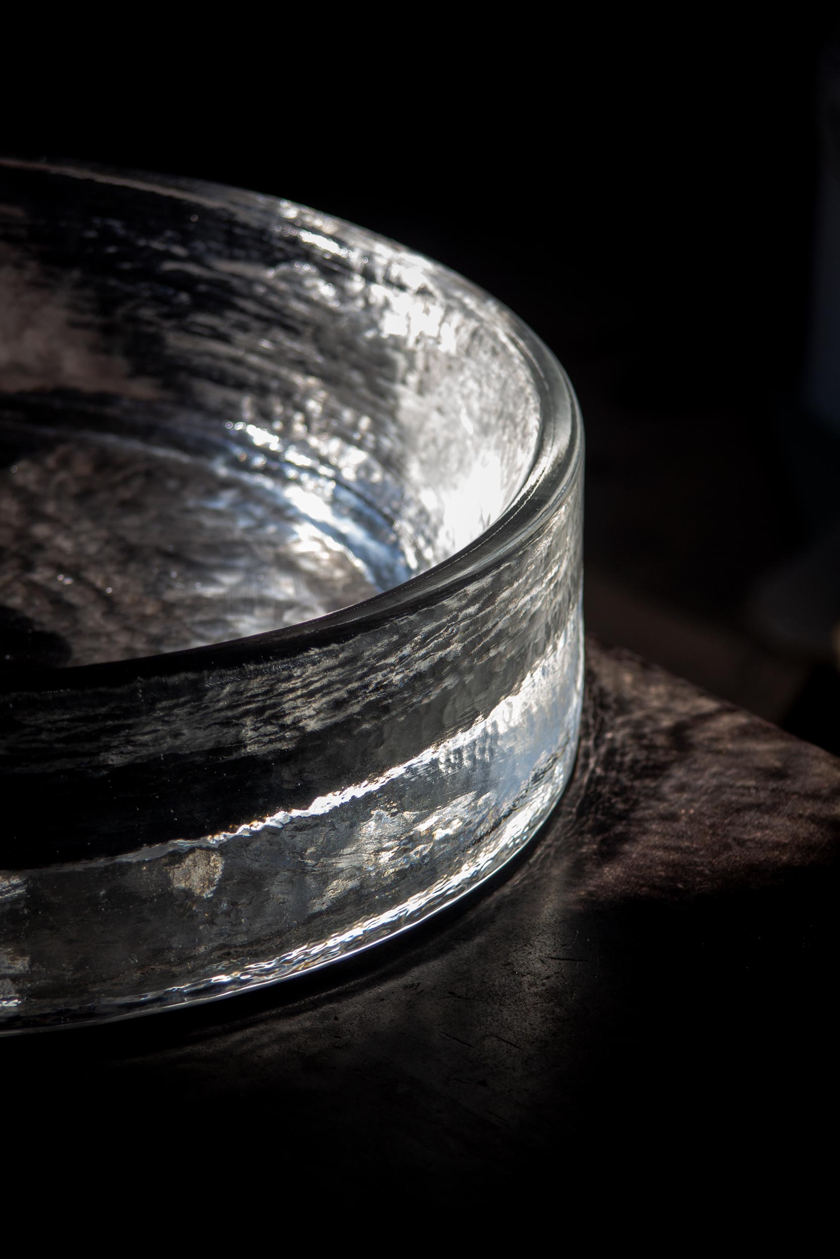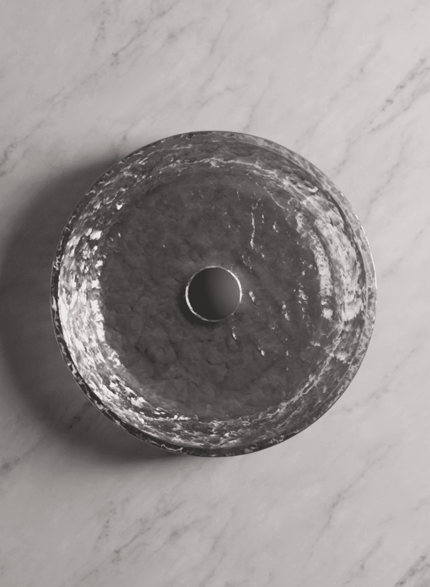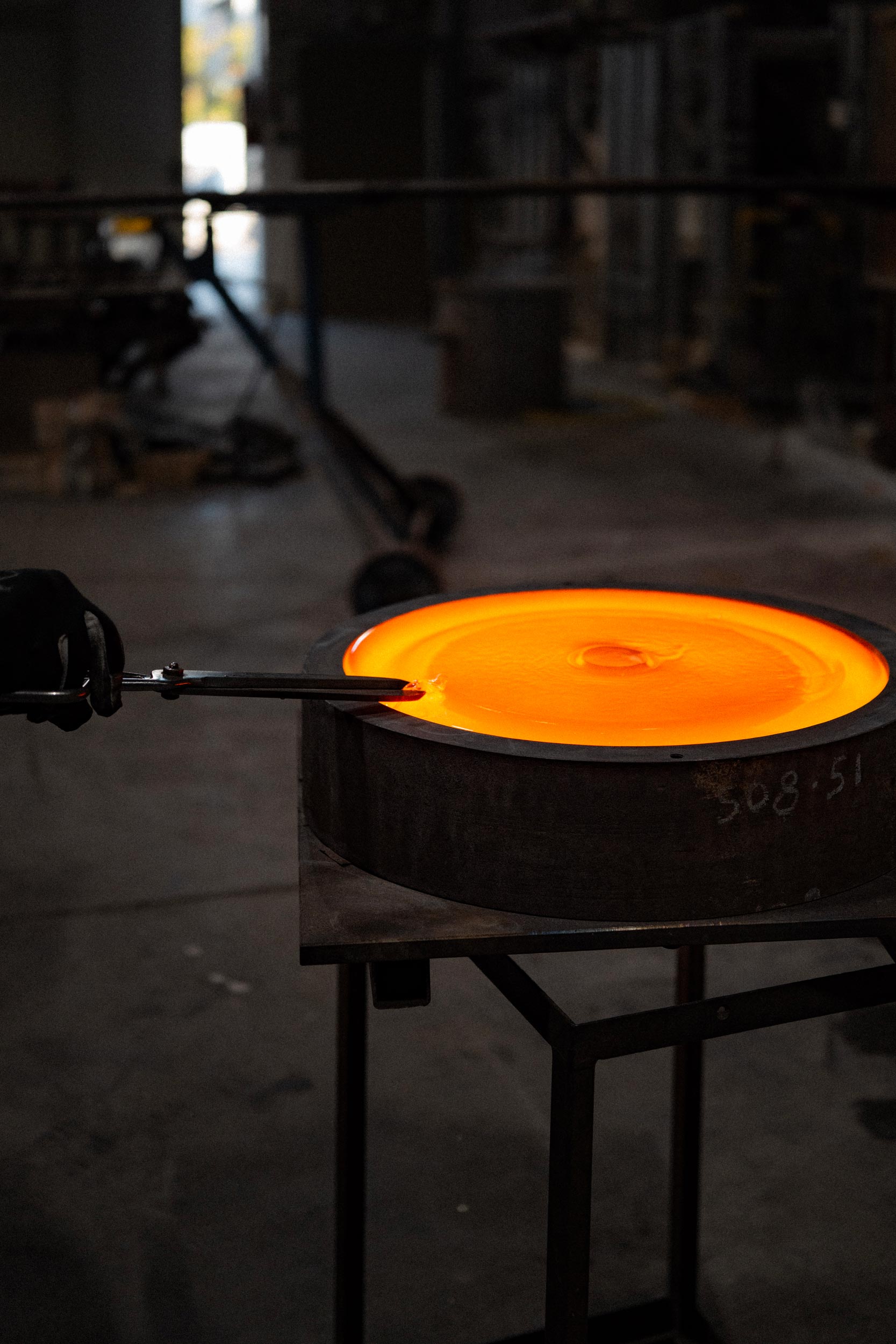 Each basin begins as a mass of eighteen kilograms of glass, fused at over 1200 degrees and poured into a mould. The cooling is slow and precisely controlled: the glass contracts where it meets the mould, creating subtle irregularities that are left untouched. The resulting surface is alive, almost hammered in texture, never identical. An object that does not lie: every detail reveals its origin.
