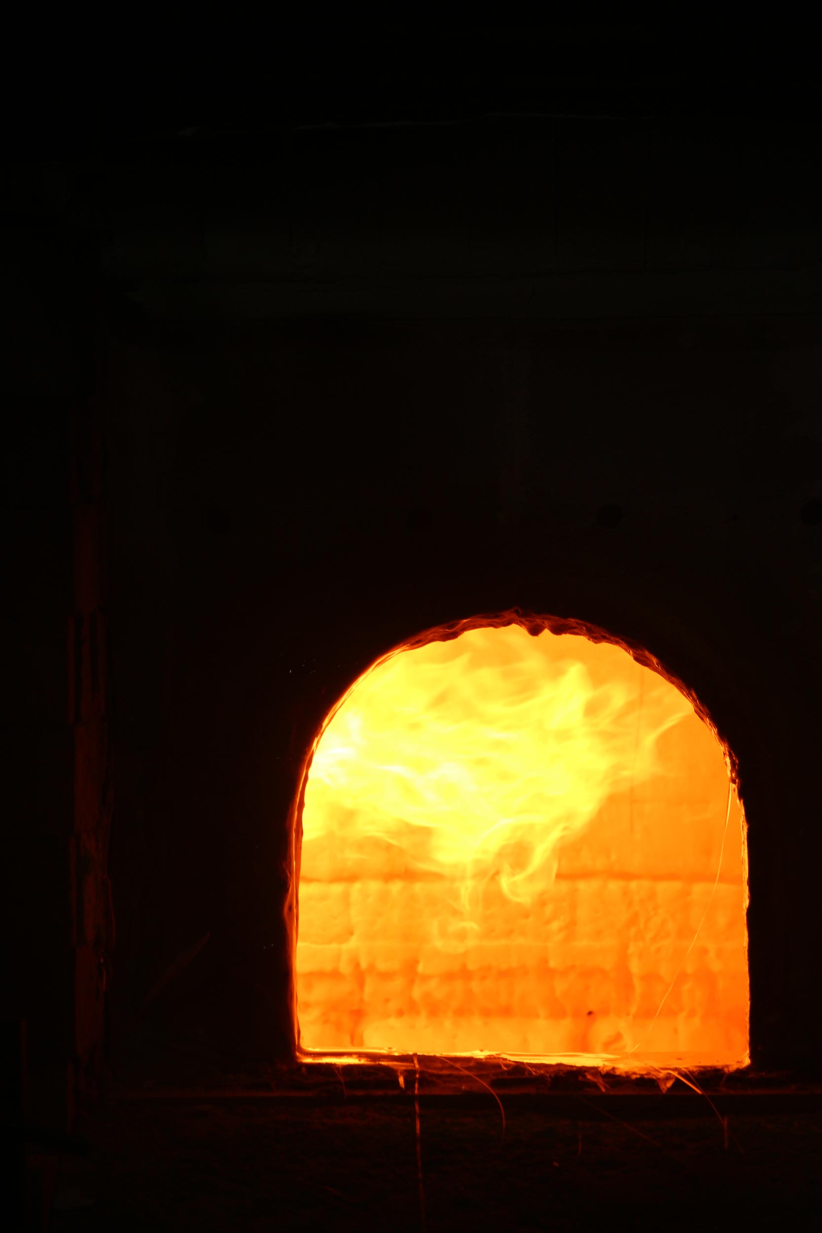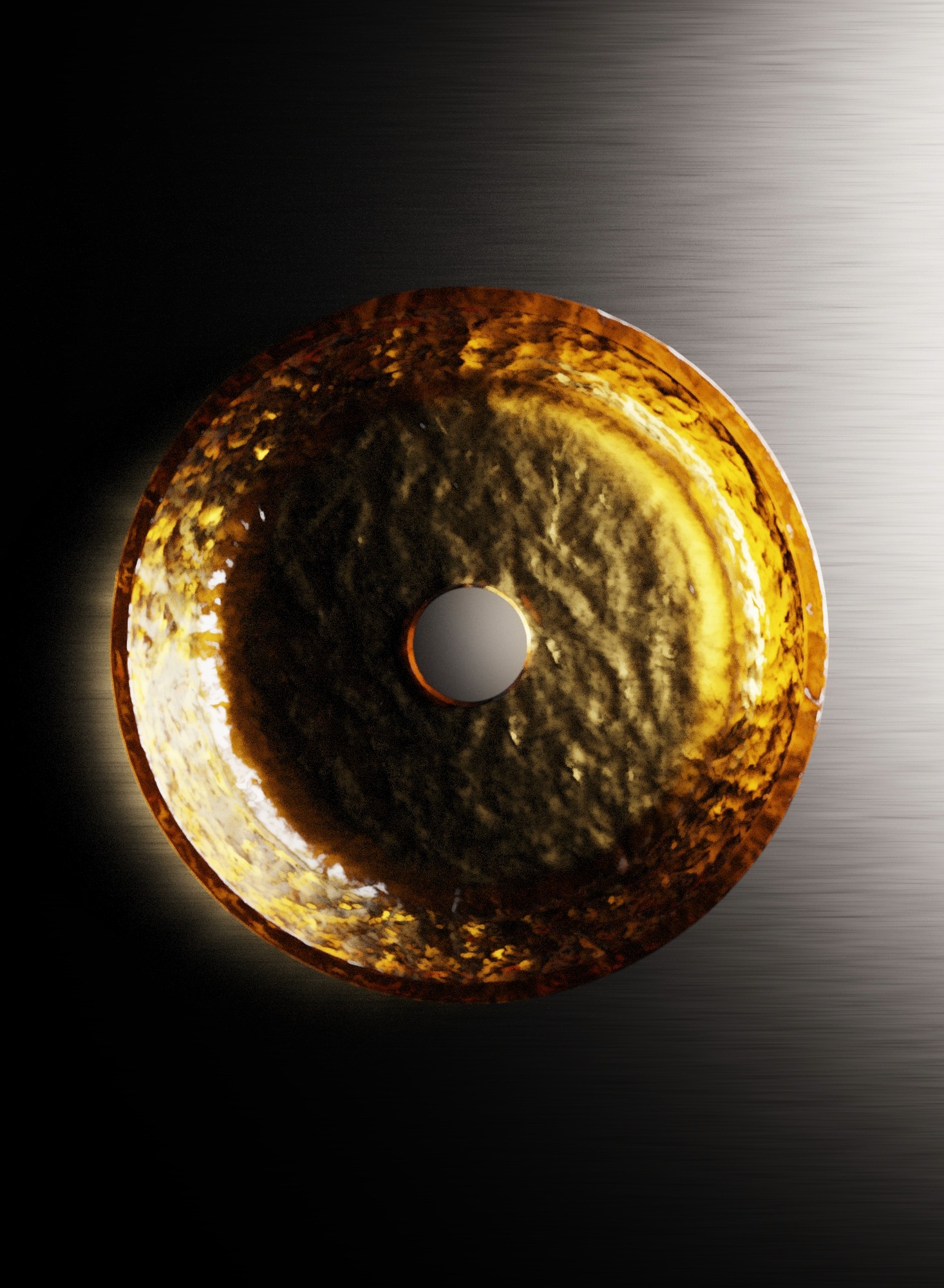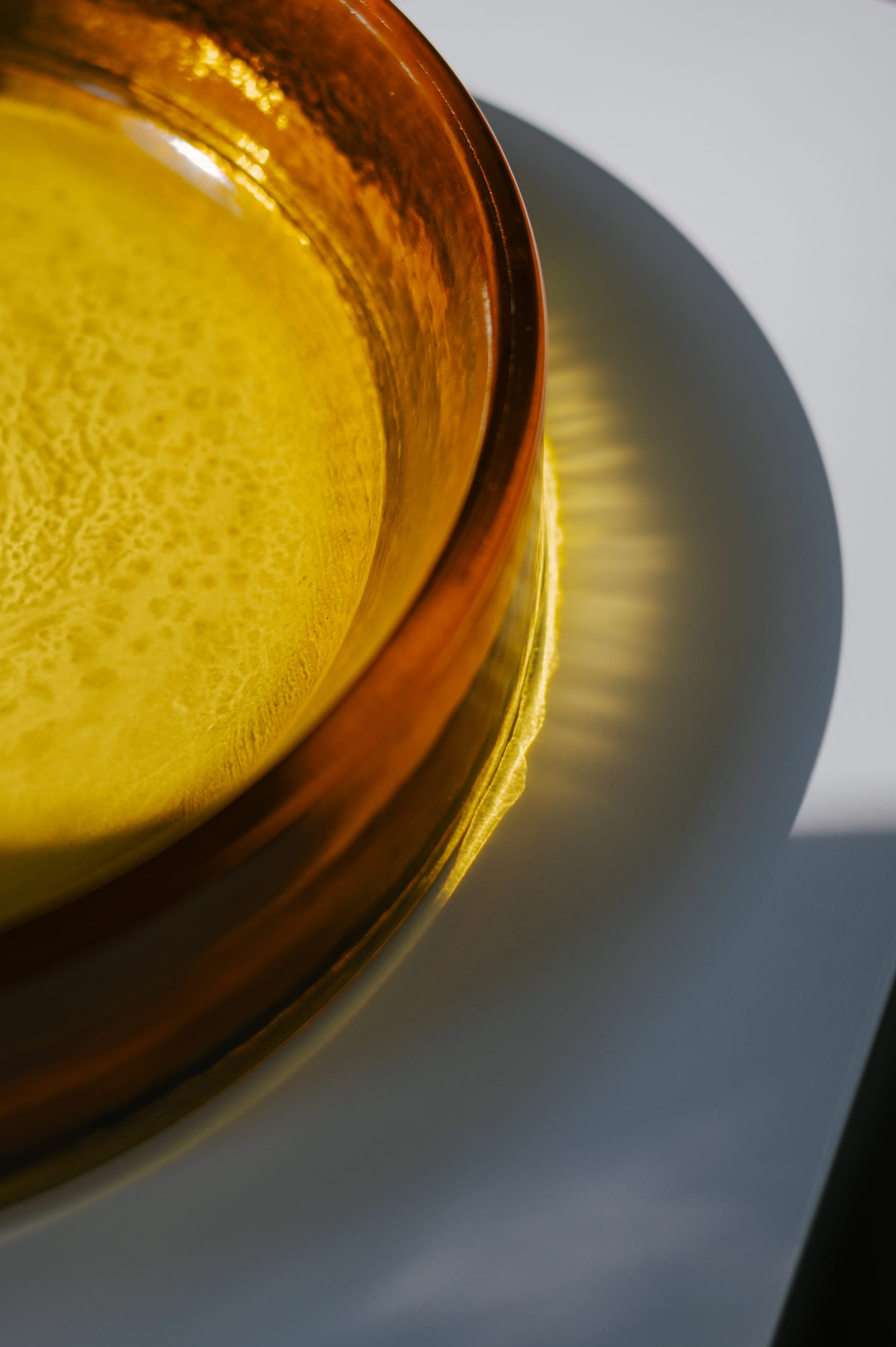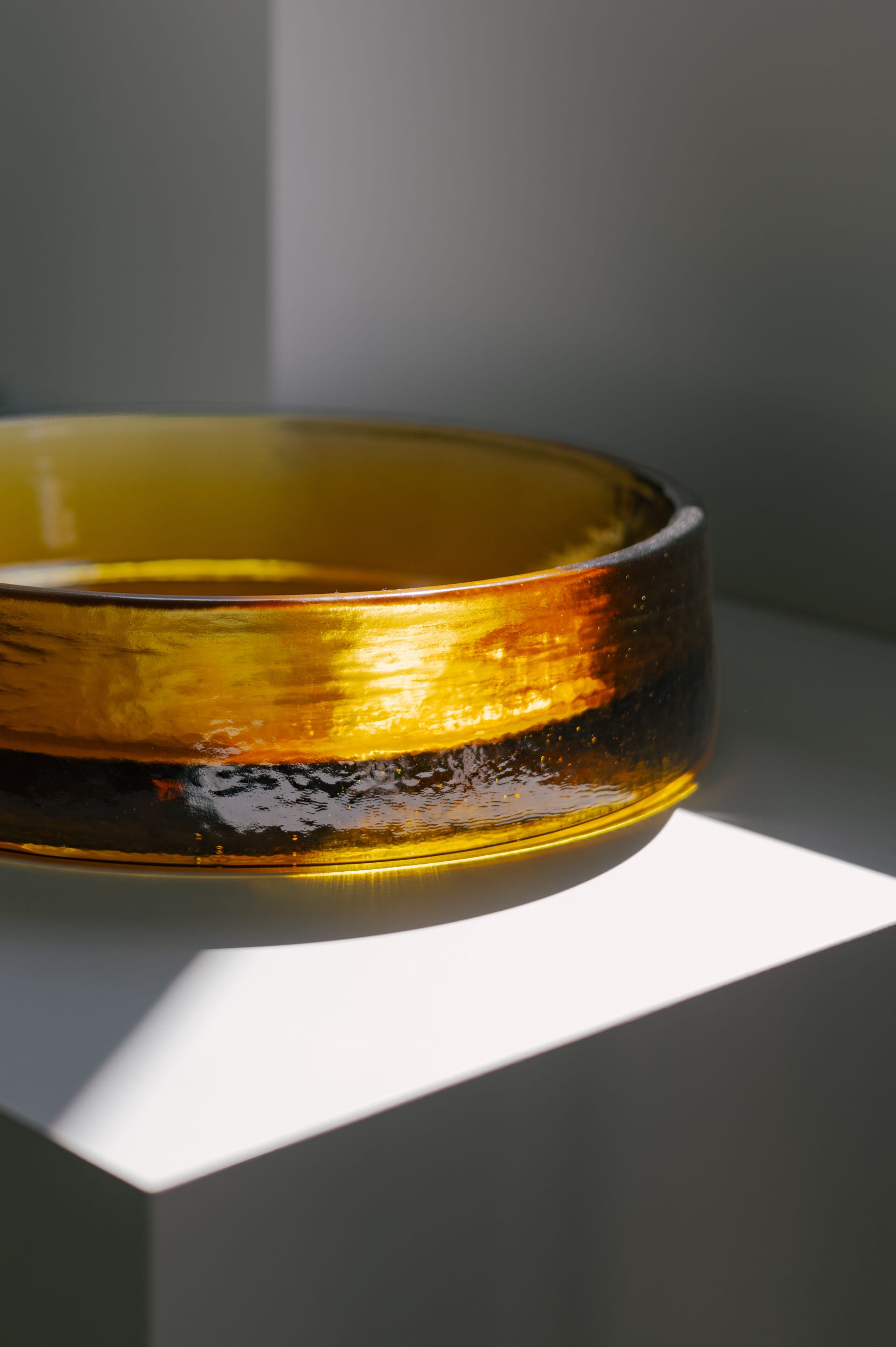 Each basin begins as a mass of eighteen kilograms of glass, fused at over 1200 degrees and poured into a mould. The cooling is slow and precisely controlled: the glass contracts where it meets the mould, creating subtle irregularities that are left untouched. The resulting surface is alive, almost hammered in texture, never identical. An object that does not lie: every detail reveals its origin.