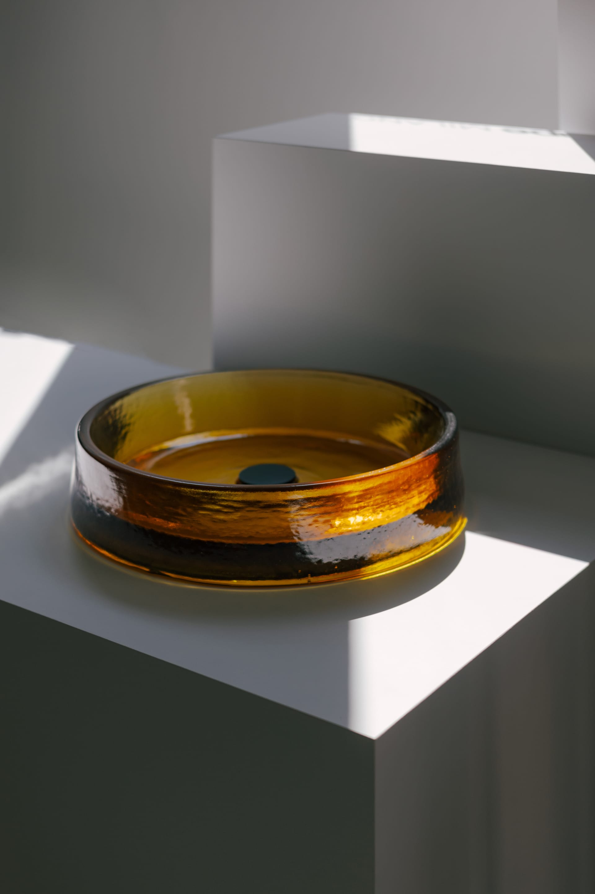 With Massicci, glass ceases to be transparency and becomes volume. Designed by Marco Zito, this basin is born from molten glass poured into a mould, left to cool slowly until it finds its form—a dense, compact presence, shaped by time and temperature.