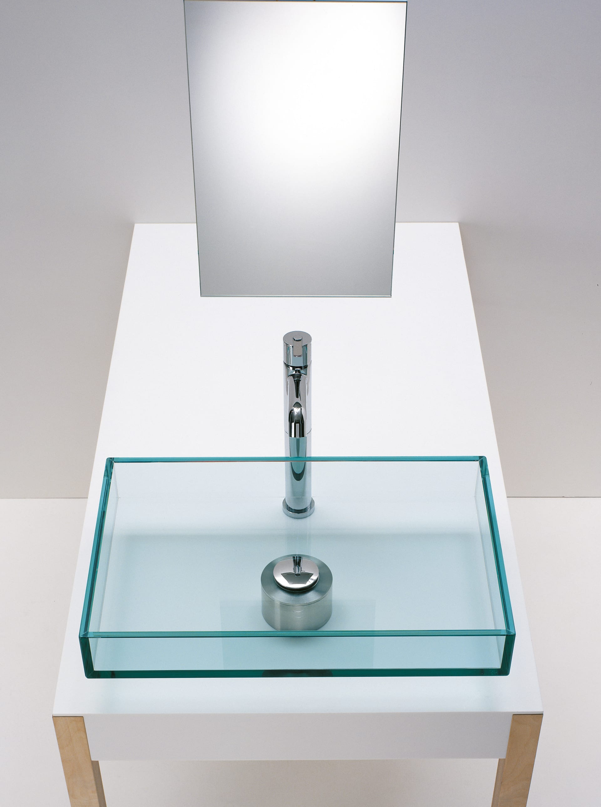 Designed by Benedini Associati in 2000 and produced until 2016, the 001 basin was created by precisely bonding transparent glass sheets. A light, minimal composition, designed to let light pass through and engage with the space delicately.