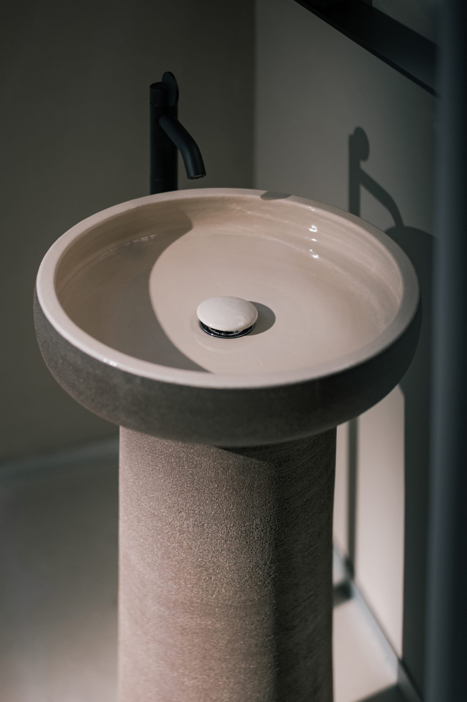 The Cenote washbasins explore the expressive potential of raw and refined surfaces. Crafted in natural or dark refractory clay, they are defined by their textured exteriors and glazed interiors—now also available in green and cappuccino. The 45 cm countertop version is also available in solid surface geal coat finish, expanding the collection’s versatility across different settings, including outdoor use (when in dark clay or Petit Granit). With a range of sizes, finishes, and configurations, Cenote brings tactile depth to any space.