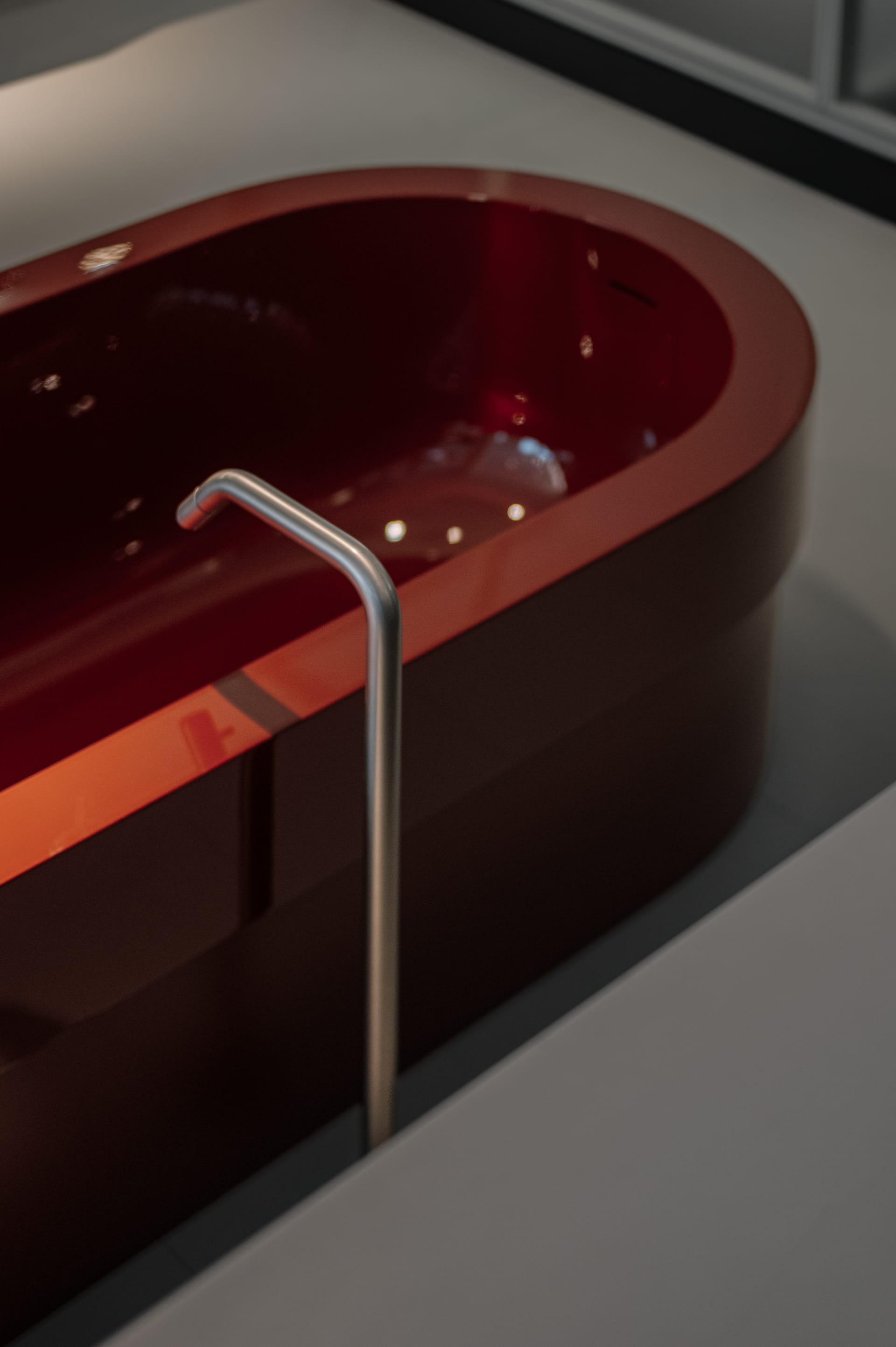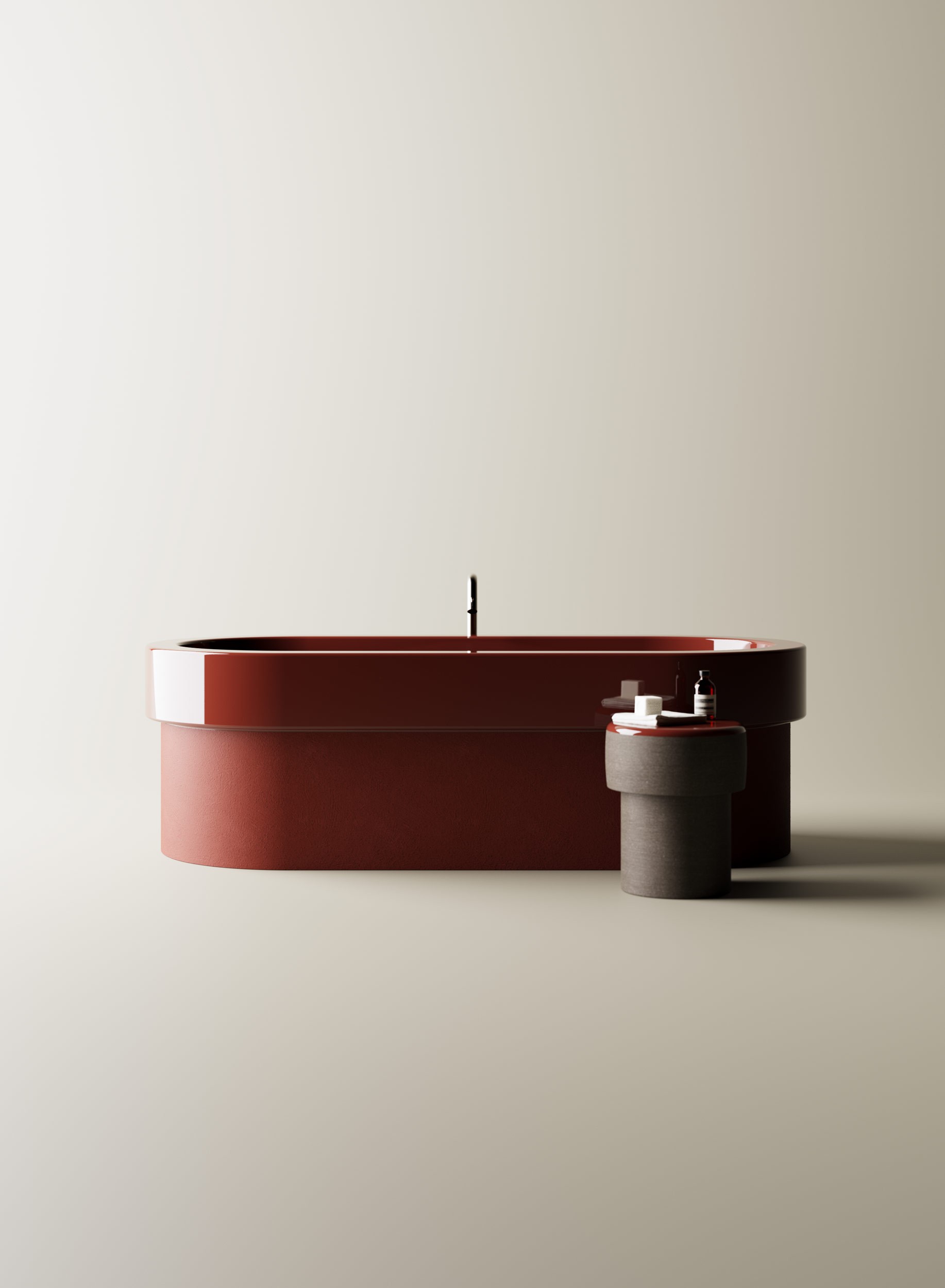 Handcrafted through a slow, deliberate process, the Cenote bathtub embodies a dialogue between material, gesture, and time. Initially shaped in fireclay, then in volcanic stone, it now comes in solid surface geal coat finish, here presented with a glossy interior and matt exterior. Generous and sculptural, Cenote offers a deeply sensorial bathing experience.
