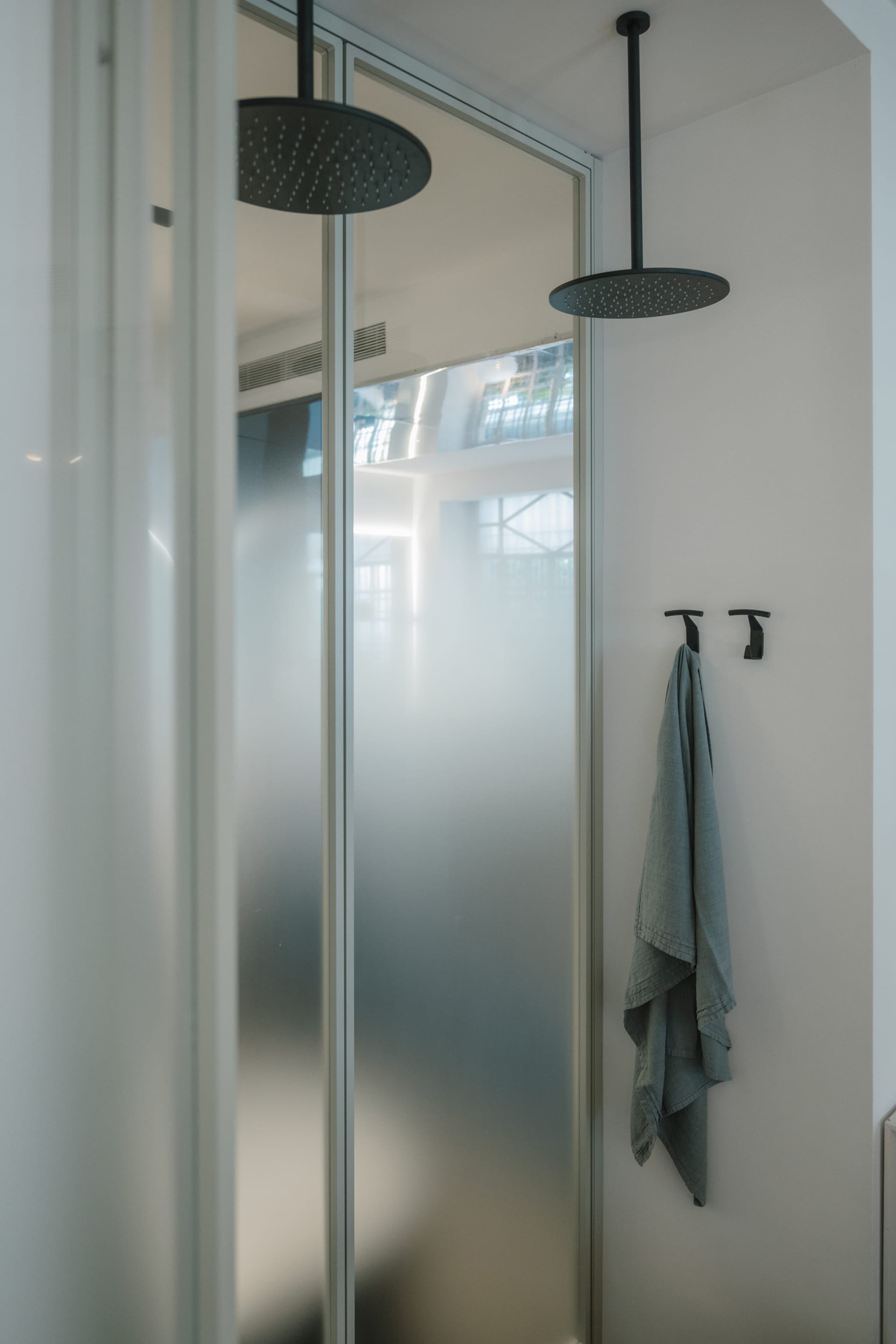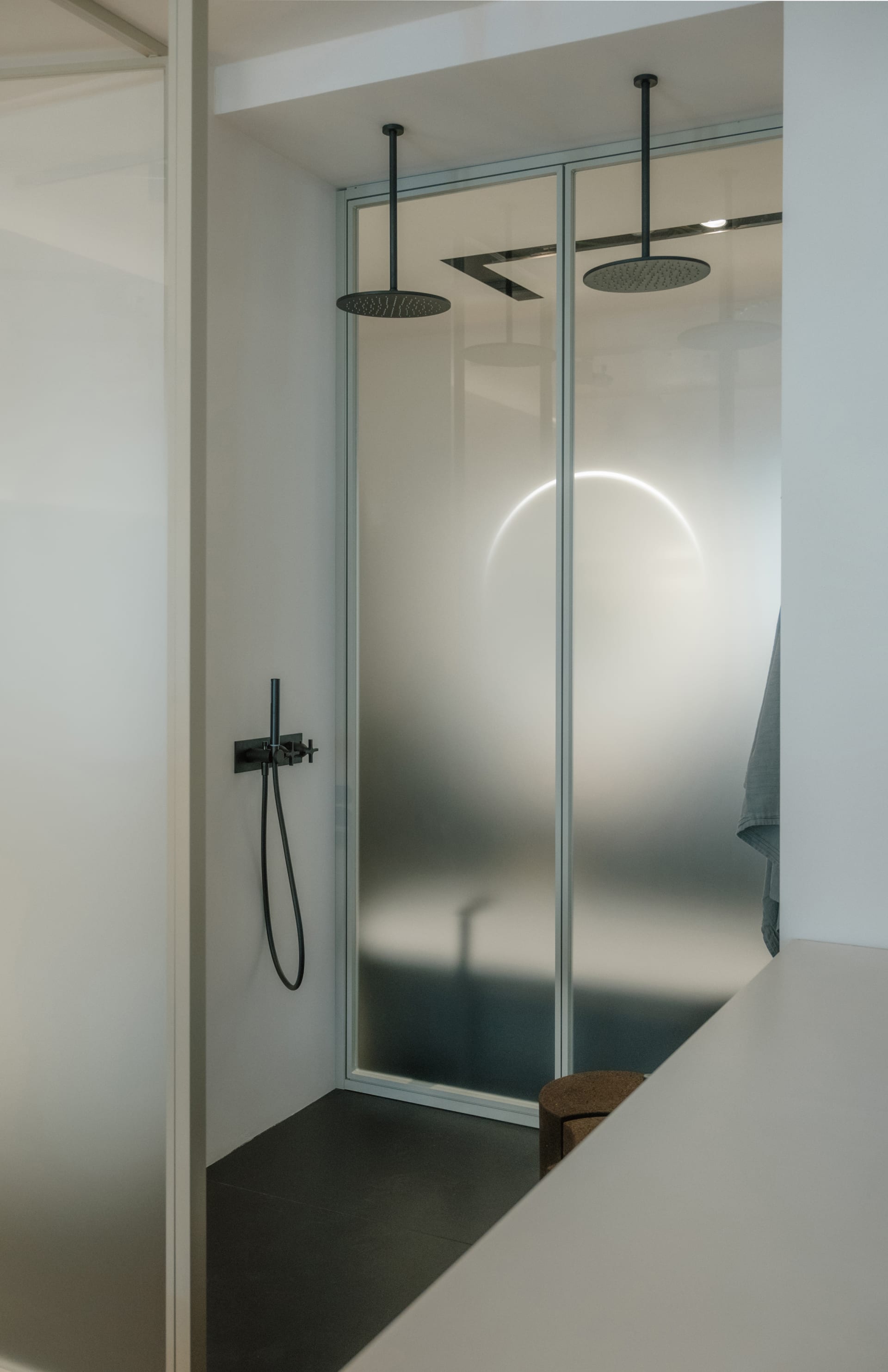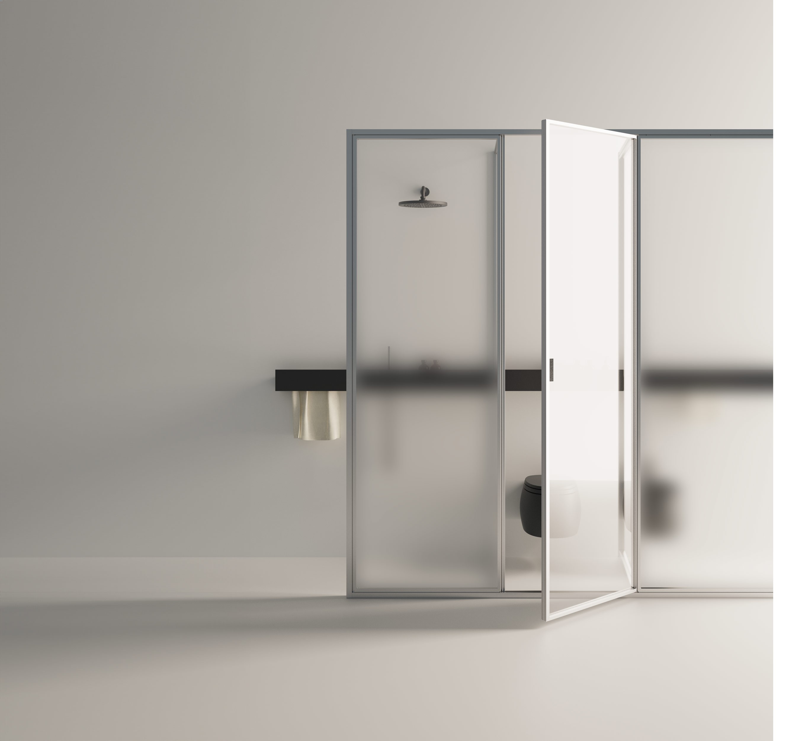 The custom-developed aluminium profile ensures stability and precision, even at significant heights. With optional gaskets for water sealing, it can also function as a shower enclosure, offering visual continuity and a near-transparent architectural presence. A wide range of finishes for profiles, glass, and handles allows for seamless integration into diverse interior contexts.